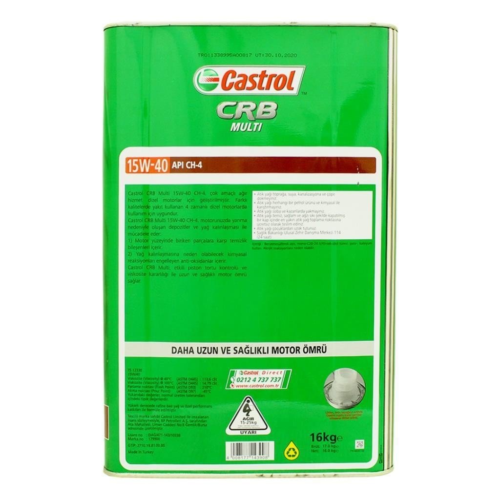 Castrol CRB Multi 15W-40 CH-4, çok amaçlı, ağır hizmet tipi dizel motor yağıdır. Farklı kalitelerde yakıt kullanan yüksek hızlı 4 zamanlı dizel motorlarda kullanım için uygundur.